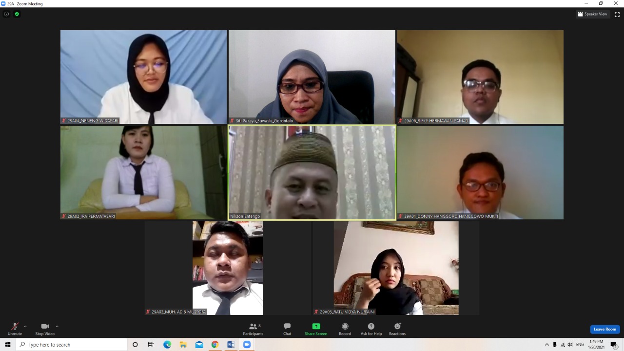 Kepala Sekretariat Bawaslu Provinsi Gorontalo Nikson Entengo Saat Memberikan Arahan Pada Enam orang CPNS masing-masing mengisi formasi analisis barang milik negara, analisis perencanaan anggaran, analisis materi sidang, analisis hukum, analisis sumber daya manusia dan analisis pemilihan umum melalui meeting Zoom, Rabu ( 20/01/2021 ). Foto Norpin Ahmad[/caption]