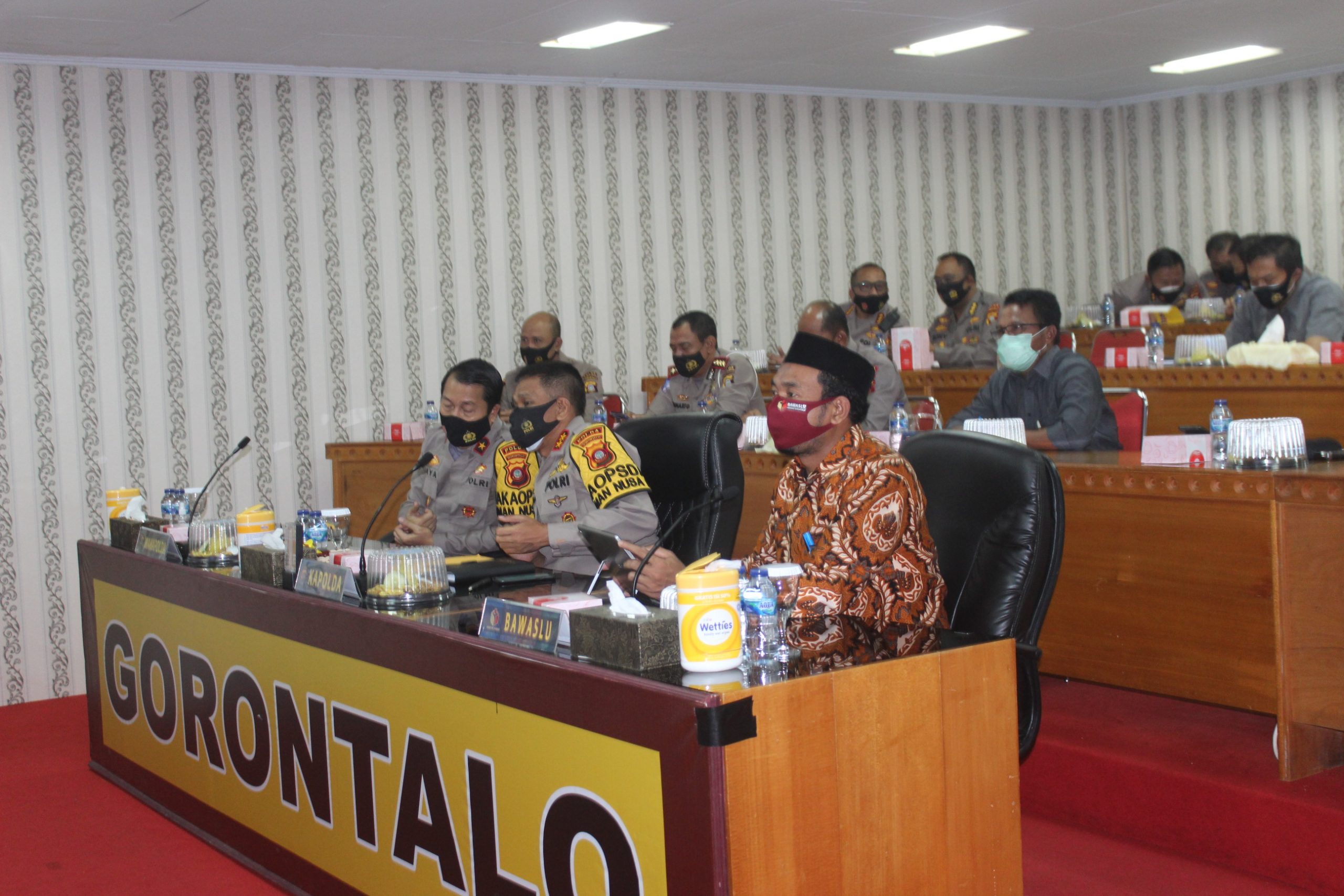 Sementara itu, Kapolda Gorontalo menyampaikan ada dua hal yang penting dilakukan yakni ; Deklarasi seluruh pihak untuk menunjung tinggi protokol kesehatan dalam setiap tahapan serta meyakinkan pemilih bahwa TPS yang dikunjungi aman dari virus covid 19. Beliau juga berharap KPU cepat mensosialisasikan pada pasangan calon maupun partai politik hingga masyarakat terkait penetapan pasangan calon yang akan dilangsungkan pada tanggal 23 September mendatang dengan tidak perlu membawa massa pendukung karena akan diumumkan melalui website resmi KPU.