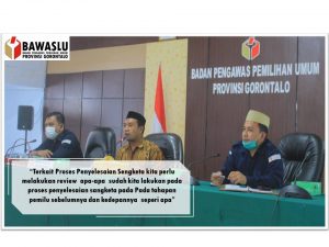 Dalam penyampaiannya pada saat membuka kegiatan, Ketua Bawaslu Provinsi Gorontalo, J. Umar mengajak kepada semua perserta Rapat untuk kemudian melakukan evaluasi atau mereview apa-apa sudah kita lakukan pada proses penyelesaian sangketa pada Pada tahapan pemilu sebelumnya dan kedepannya seperi apa. Ungkap Beliau.