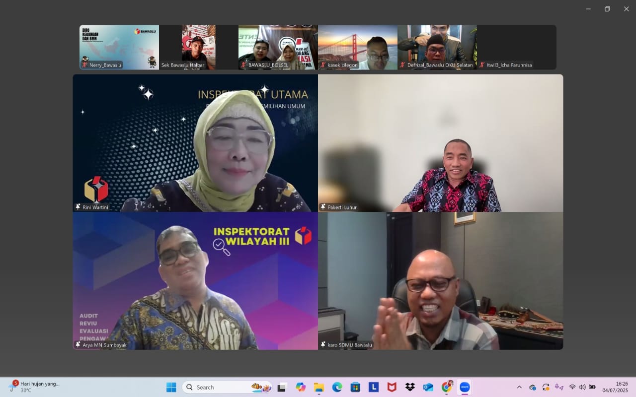 Rapat ini merupakan tindak lanjut dari undangan resmi Bawaslu RI nomor B-10/KU.00/SJ/07/2025 tertanggal 2 Juli 2025. Dari Bawaslu RI, hadir Inspektur Utama (Irtama) Ibu Rini Wartini, Kepala Biro Keuangan dan BMN Bapak Pekerti Luhur, serta Kepala Biro SDM dan Organisasi (SDMO) Bapak Jufri Syahrudin.