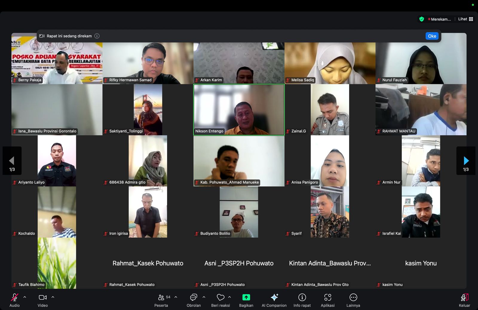 Gorontalo — Menindaklanjuti Surat Bawaslu RI Nomor B.224/KP.08/DI/06/2025 tertanggal 24 Juni 2025, Bawaslu Provinsi Gorontalo menggelar rapat sosialisasi terkait kehadiran pegawai. Kegiatan ini dilaksanakan secara daring melalui Zoom Meeting pada Kamis (10/07/2025) dan diikuti oleh seluruh jajaran pegawai Bawaslu Provinsi serta Bawaslu Kabupaten/Kota se-Provinsi Gorontalo.