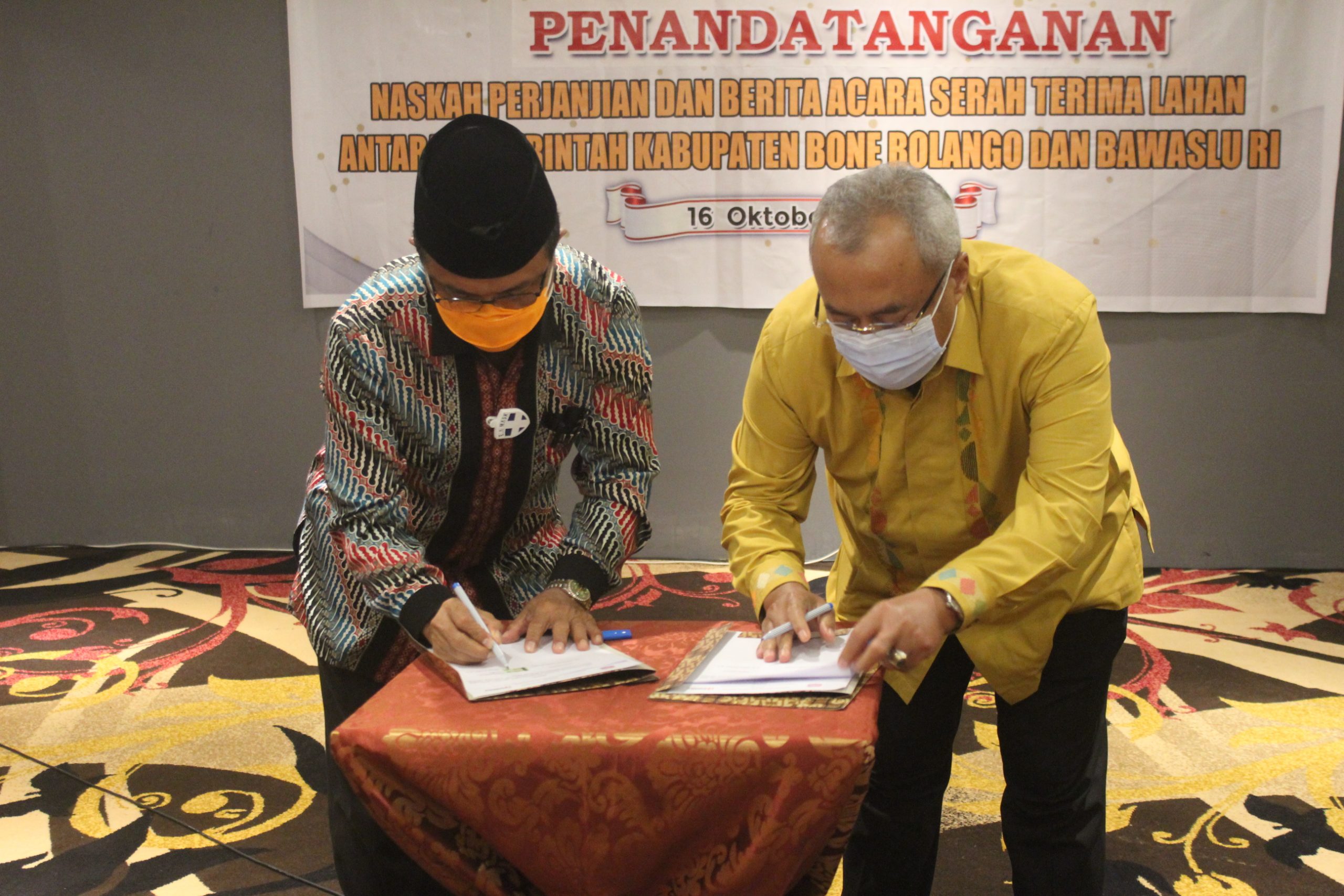 Sekretaris Jenderal Bawaslu RI Gunawan Suswantoro bersama Sekretaris Daerah Kabupaten Bone Bolango Ishak Ntoma menandatangani perjanjian hibah tanah pembangunan kantor sekretariat Bawaslu Kabupaten Bone Bolango di hotel Aston Gorontalo pada (16/10/2020).