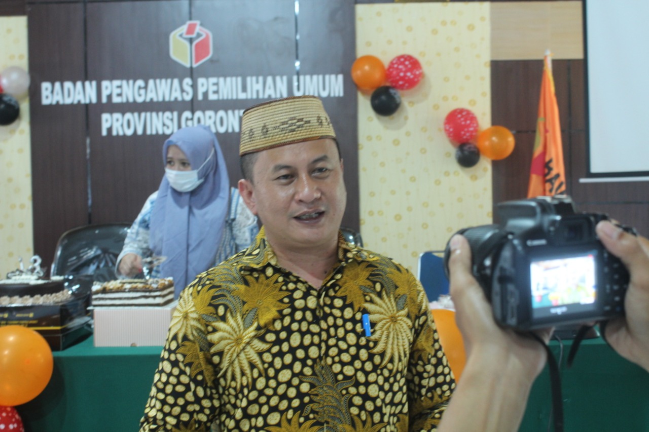 Anggota Bawaslu Prov. Gorontalo Ahmad Abdullah saat diwawancarai pasca perayaan HUT ke-13 Bawaslu, Gorontalo (9 April 2021).[/caption]