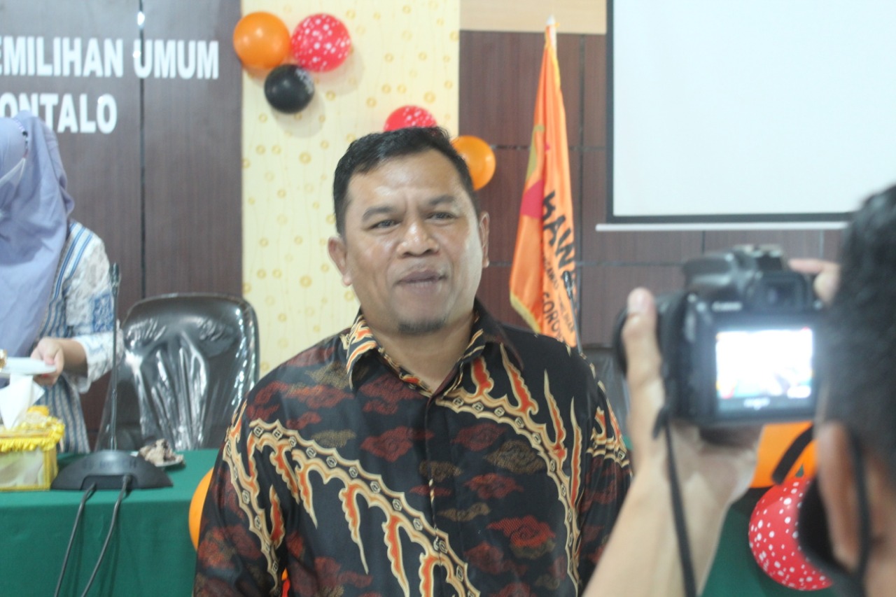Kasek Bawaslu Prov. Gorontalo Nikson Entengo memberikan keterangan pasca perayaan semarak HUT Bawaslu yang ke-13, Gorontalo (9 April 2021)[/caption]