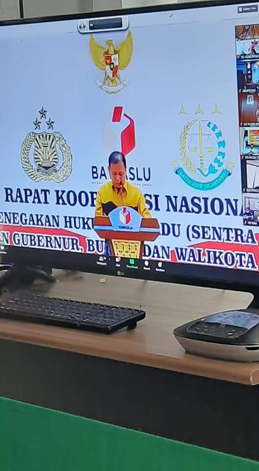 Sentra Penegakan Hukum Terpadu (Sentra-Gakumdu) Provinsi Gorontalo yang terdiri dari unsur Pimpinan Bawaslu Provinsi Gorontalo; J.Umar, Ahmad Abdullah, dan Idris Usuli Unsur Kepolisian Daerah Gorontalo AKBP. Sahrul, SH (Koordinator) serta Unsur Kejaksaan Tinggi Gorontalo Kurniawan,SH, M.H. (Koordinator) menghadiri kegiatan Rapat Koordinasi Nasional Sentra Penegakan Hukum Terpadu dalam rangka Pemilihan Gubernur, Bupati, dan Walikota Tahun 2020 secara daring bertempat di kantor Bawaslu Provinsi Gorontalo. Senin, (31/08/2020).
