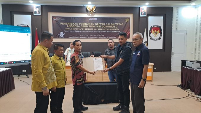 Gorontalo – Anggota Bawaslu RI Lolly Suhenty, didampingi oleh Tim Asisten (TA) dan Kepala Biro (Karo), melakukan monitoring terhadap pelaksanaan pengawasan penerimaan perbaikan Daftar Calon Tetap (DCT) Anggota DPRD Provinsi Gorontalo Daerah Pemilihan (Dapil) 6, yang mencakup Kabupaten Boalemo dan Kabupaten Pohuwato. Monitoring ini dilakukan di Kantor KPU Provinsi Gorontalo, Rabu, (26/06/2024), menyusul putusan Mahkamah Konstitusi Nomor 135-01-08-29/PHPU.DPR-DPRD-XXII/2024.