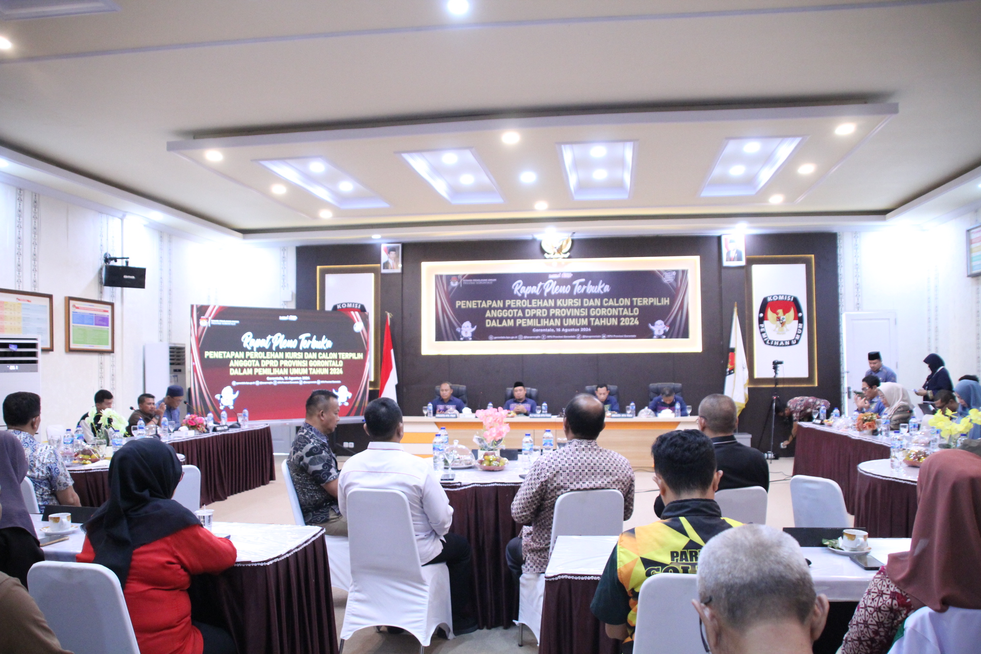Gorontalo - Rapat Pleno Terbuka untuk penetapan perolehan kursi dan calon terpilih Anggota DPRD Provinsi Gorontalo dalam Pemilihan Umum Tahun 2024 digelar di Kantor KPU Provinsi Gorontalo, Jum’at, (16/08/2024). Acara ini dihadiri oleh Anggota Bawaslu Provinsi Gorontalo, Moh. Fadjri Arsyad dan John Hendri Purba.