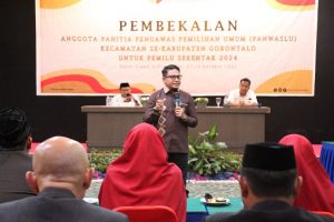 Gorontalo, Bawaslu Provinsi Gorontalo - Integritas dalam melaksanakan tugas dan kewenangan pengawasan pemilu diperlukan untuk menjalankan amanah undang-undang, kualitas dan kuantitas penyelenggara Panwaslu Kecamatan akan menjadi sorotan masyarakat dalam menjalankan tugas. Olehnya, Panwaslu Kecamatan harus work professionally and consistently. Hal tersebut diungkapkan Ketua Bawaslu Provinsi Gorontalo Idiris Usuli saat memberikan pembekalan bagi Panwascam Se-Kabupaten Gorontalo yang berlangsung di Grand Q Hotel Kota Gorontalo Kamis (27/10/2022).