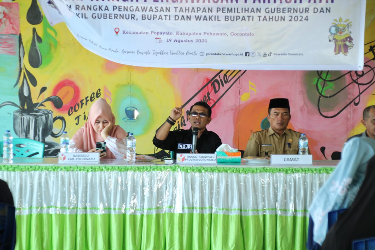 Anggota Bawaslu Provinsi Gorontalo Fadjri Arsyad saat membuka Kegiatan Forum Warga di Kecamatan Popayato, Senin (19/08/2024).[/caption]