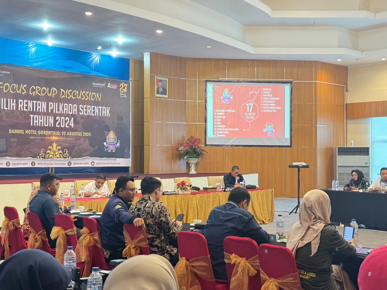 Anggota Bawaslu Provinsi Gorontalo, John Hendri Purba saat hadiri kegiatan Focus Discussion Pemilih Rentan Pilkada Serentak Tahun 2024 yang diselenggarakan oleh KPU Provinsi Gorontalo di Hotel Damhil pada Kamis (22/08/2024)[/caption]