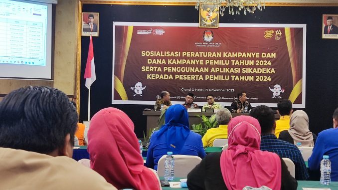 Gorontalo, Bawaslu Gorontalo - Ketua Bawaslu Provinsi Gorontalo, Idris Usuli, menghadiri Sosialisasi Peraturan Kampanye dan Dana Kampanye Pemilu Tahun 2024 serta penerapan aplikasi Sikadeka. Kegiatan, yang diselenggarakan oleh KPU Provinsi Gorontalo di Hotel Grand Q Kota Gorontalo, Jum'at (17/11/2023), bertujuan memberikan pemahaman kepada peserta Pemilu 2024.