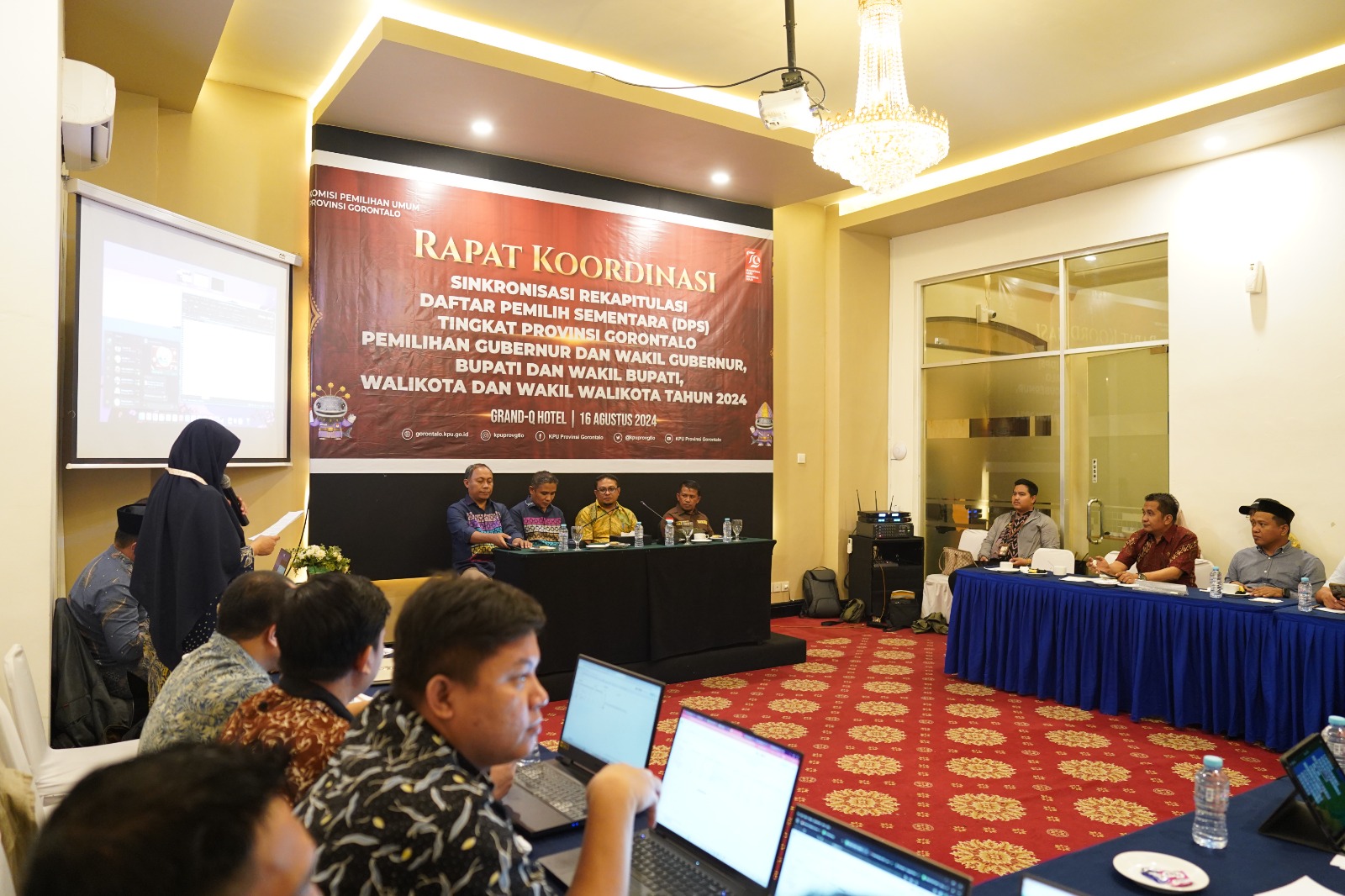 Gorontalo — Rapat Koordinasi Sinkronisasi Daftar Pemilih Sementara (DPS) tingkat provinsi untuk pemilihan Gubernur, Bupati, dan Walikota Tahun 2024 digelar di Hotel Grand Q, Gorontalo, Oleh KPU Provinsi Gorontalo, Jumat (16/08/2024). Acara ini dihadiri oleh Ketua dan Anggota Bawaslu Provinsi Gorontalo.
