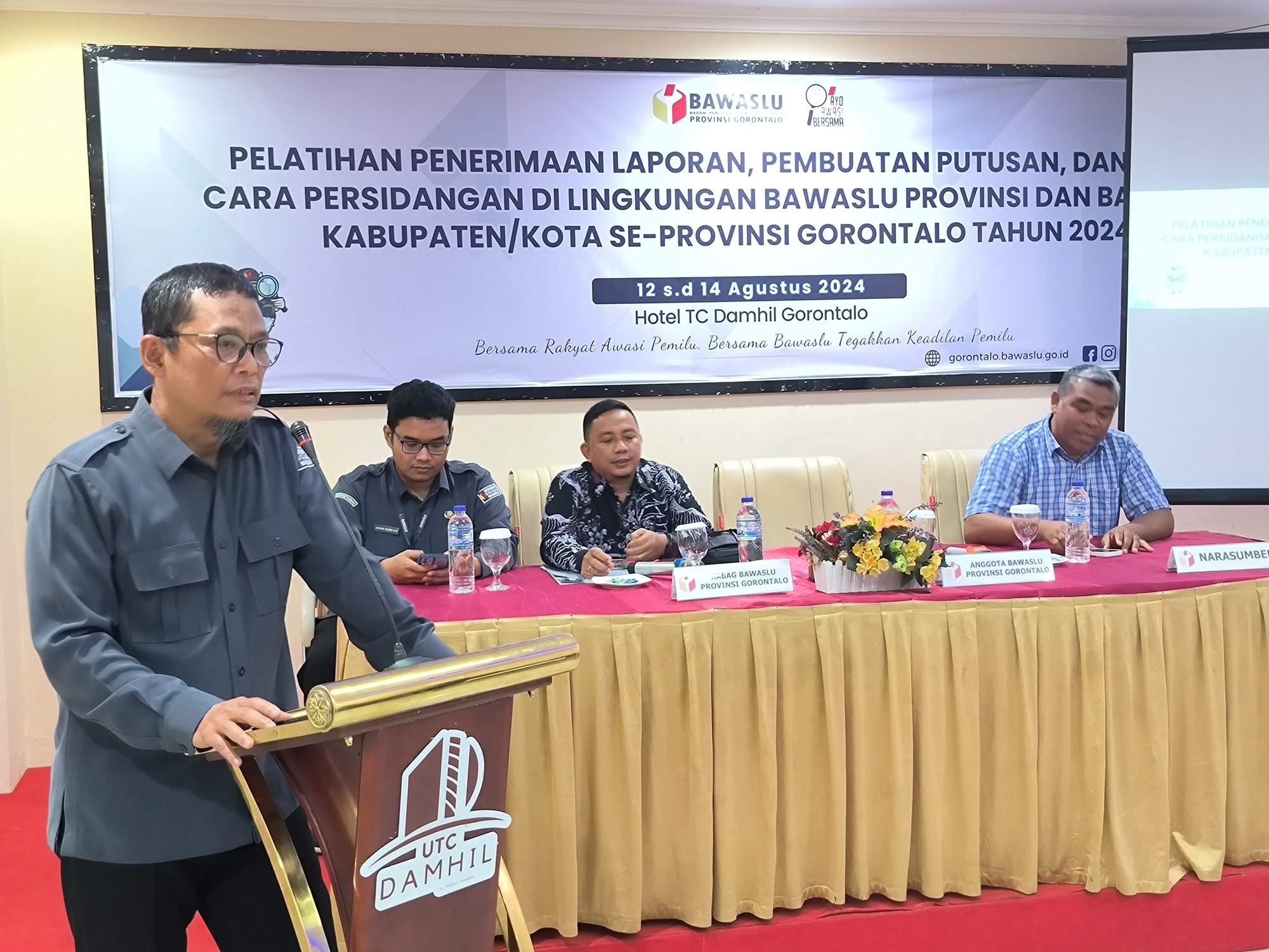 John Hendri Purba selaku Kordiv Penanganan Pelanggaran, Data, dan Informasi Bawaslu Provinsi Gorontalo saat membuka Kegiatan Pelatihan di Hotel Damhil, Senin (12/08/2024).[/caption]